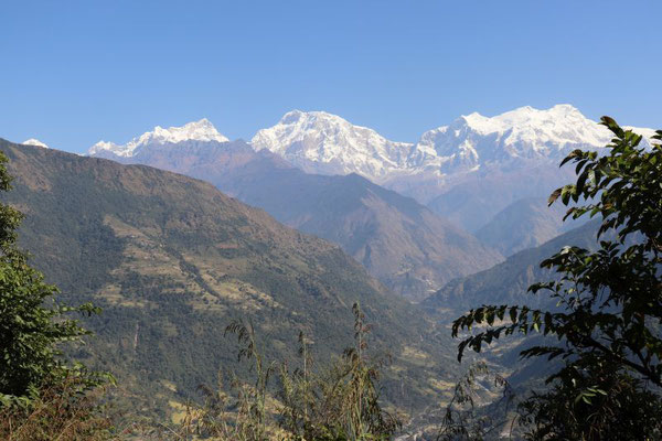 Au tout petit matin, sous une lumière zen, la vue s’étend du Macchapuchare au groupe du Manaslu en passant par les must de la chaîne des Annapurnas. Narish nous répète patiemment le nom de tous ces géants, mythiques pour certains, évocateurs pour d’autres, de récits épiques, de dites conquêtes tout droit sorties des récits d’ himalayisme. Depuis la table du petit –déjeuner, à portée de regard, ni exploit ni douleur ni fatigue pour nous, mais des pancakes et autres créations artistiques de Ram. Lestés, nous entamons le retour. Népal de tous les contrastes : après 3heures de descente longue et raide dans la jungle, ce soir c’est la ville et le monde des hommes. Depuis le hameau dispersé de Ghalegaon, une piste poussiéreuse nouvellement tracée nous mène à Bhurjung Khola. Curieuse impression d’arriver en ville. Heureusement, le camp est installé au bord de la rivière dans un lieu serein. Dernier dal bhat avec l’équipe, danses, chants, partage, il semblerait que chacun ait apprécié la compagnie de chacun.